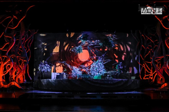 大幕拉开,扭曲交错的绞杀榕枝条自台口一侧蔓延而出。伴随着音乐的律动,四名青春洋溢的学生带着鲜花与礼物登场,为老师庆祝生日。但在热情与笑容背后,一场精心策划的残酷“禁忌游戏”已然拉开帷幕。