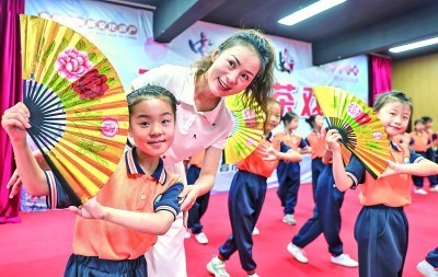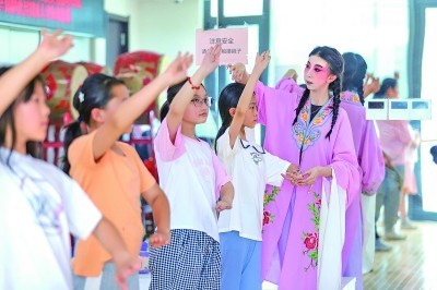 在山东省青岛市李沧区文化馆,大学生志愿者指导孩子练习京剧基本动作。张鹰摄/光明图片