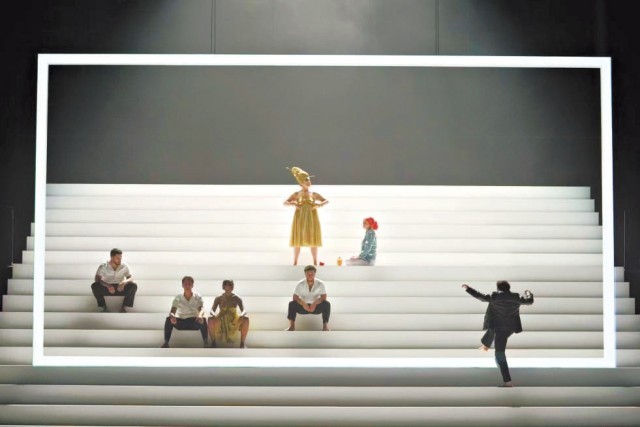 《屏风》的舞台上没有屏风,有的,只是几近铺天盖地的白色台阶。与舞台等宽的二十几级白色台阶,向上延展约占一半的后景视野。这一大胆设计除了视觉美学上的冲击,更多服务于剧情隐喻。