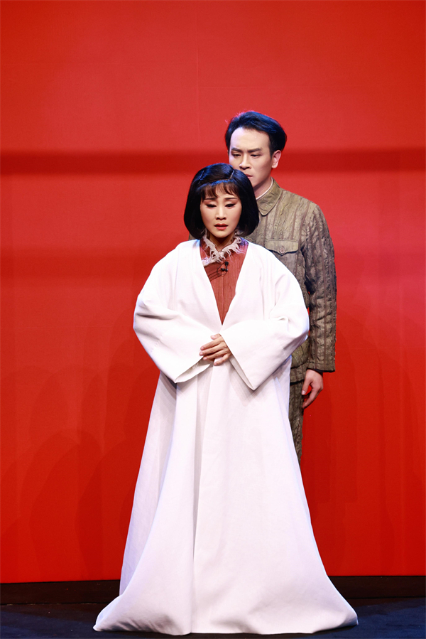 河北梆子《远去的白马》改编军旅作家朱秀海的同名长篇小说,是北京演艺集团艺术生产孵化平台的成果之一。《远去的白马》以“白马”为核心意象,通过一位普通的胶东妇女赵秀英跌宕起伏的一生,深刻诠释了“人民是历史的创造者,是真正的英雄”的宏大命题。原作小说长达32万字,罗周、安凤英、李石条、朱维英、刘杏林等一线艺术家组成的主创团队发挥戏曲及舞台艺术的特质,提炼了爱情、战斗、选择三条主线,让作品基调更加浪漫化、诗意化。舞台上,极简造型的巨大弧形墙矗立,粗粝质感无声诉说着战争的沧桑与岁月的沉重,灵动的红色线条和转台框架切割舞台空间,结合光影变化,勾勒出战火纷飞中的历史印记和人们心中永不磨灭的热血。