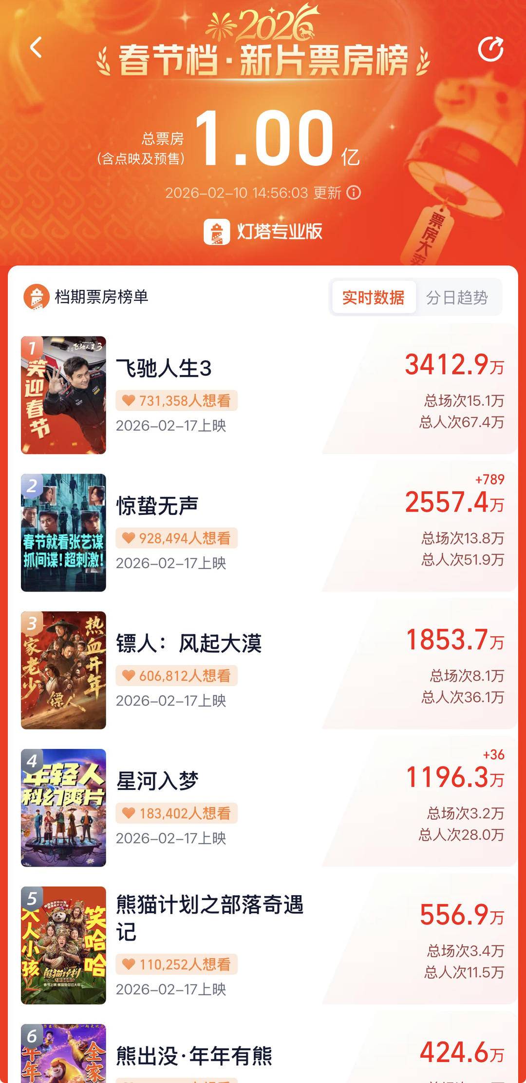 截至2月10日下午,2026春节档新片预售总票房已突破1亿元,用时29小时。