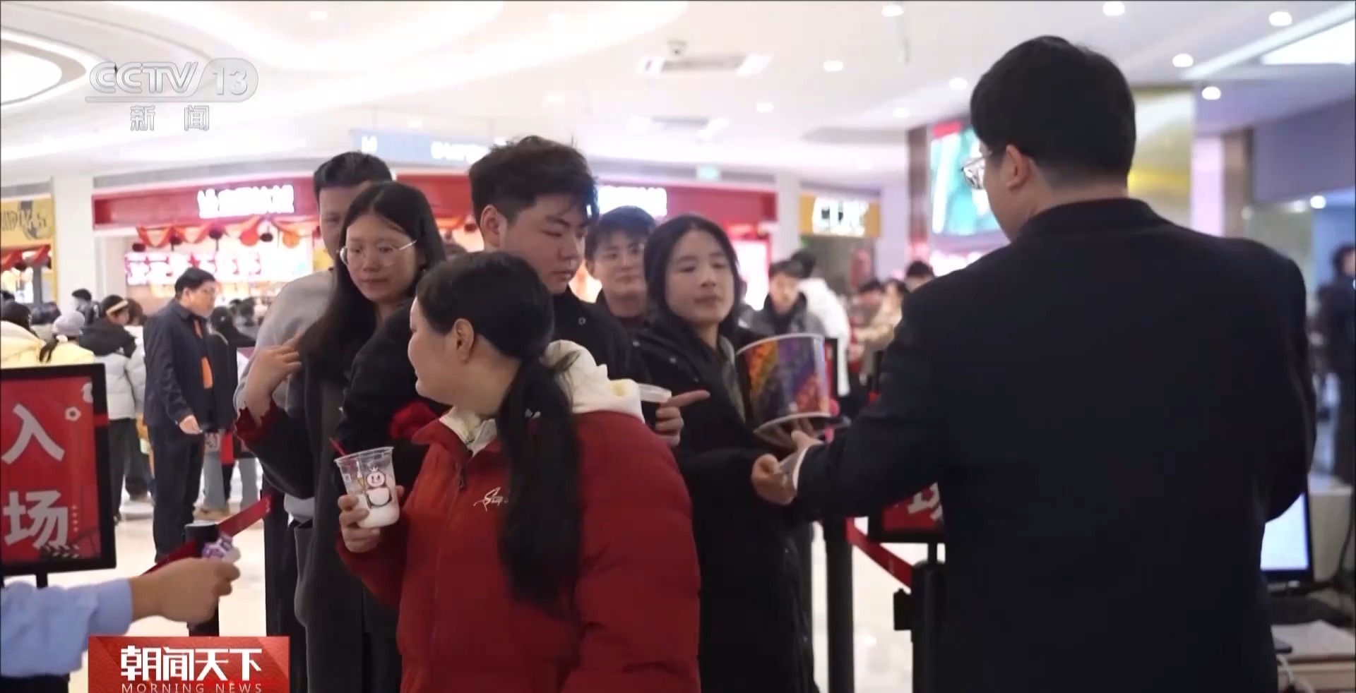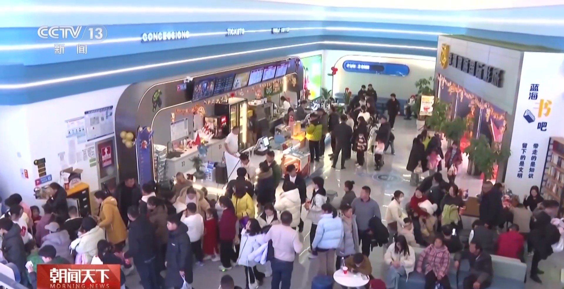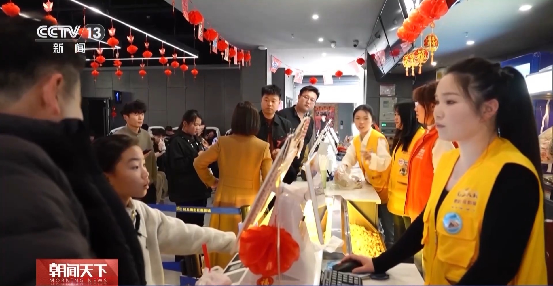 在河南省新乡市封丘县某影城,售票处前,前来购票和取票的观众络绎不绝,休息区的座椅上坐满了等待入场的观众,检票口的工作人员忙碌地引导观众入场。