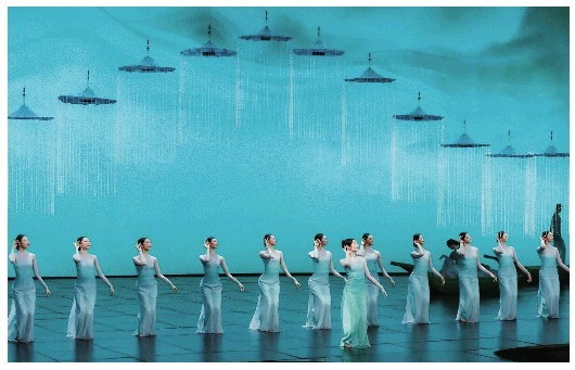 舞蹈《喜雨》则与东方美学深度融合,使高雅艺术拥有了触手可及的亲和力。领舞孟庆旸身姿轻盈如燕,率浙江音乐学院诸位学子在烟雨氤氲的舞台上勾勒出江南春雨的意趣。学子们所穿的渐变青绿色舞裙与升降屏所创造的纵深意境彼此呼应,肢体舒展处皆见妙趣:指尖轻颤若雨点落荷,细腻传神;足步流转似小舟凌波,清闲自在。随着舞段的推进,舞台色调从青绿自然过渡到金黄,演员的动作也从轻柔的“润雨”自然转至舒展的“迎春”,春雨孕育丰收美好的寓意被自如地注入每个细节,艺术表现与时代精神真正同频共振,浑然契合。