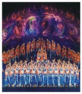 坚守文化根脉,舞蹈《丝路古韵》以文物考据型创编为根基,融合数字化舞台技术,实现了龟兹乐舞从石窟壁画到当代舞台的精准转译。作品以克孜尔石窟第38窟“天宫伎乐图”为创作蓝本,通过纹样考据与实地采风,构建了“史舞互证”的编创逻辑。编排中摒弃了对壁画的简单复刻,而是将龟兹乐舞“沉静庄严”的美学特质转化为舞台语言,将壁画中的典型体态、手势与韵律提炼为严谨的舞蹈语汇,通过“半定格”的雕塑感体态与精准的肢体控制,将“三道弯”、单折指等壁画典型符号转化为流动的韵律。在“动静相生”的叙事节奏,以及极致的“慢表达”中嵌入胡旋舞的急速旋转,不仅形成了强烈的视觉张力,更以舞蹈语汇诠释了龟兹作为东西方文明交会点的包容特质。在数字融合层面,舞台以沉浸式光影重构石窟空间,经数字化修复的壁画纹样与舞者服饰、动作虚实呼应。技术不再是视觉点缀,而是成为文化复活的载体,让千年乐舞破壁而出,实现传统舞蹈美学与现代科技的高度共生。