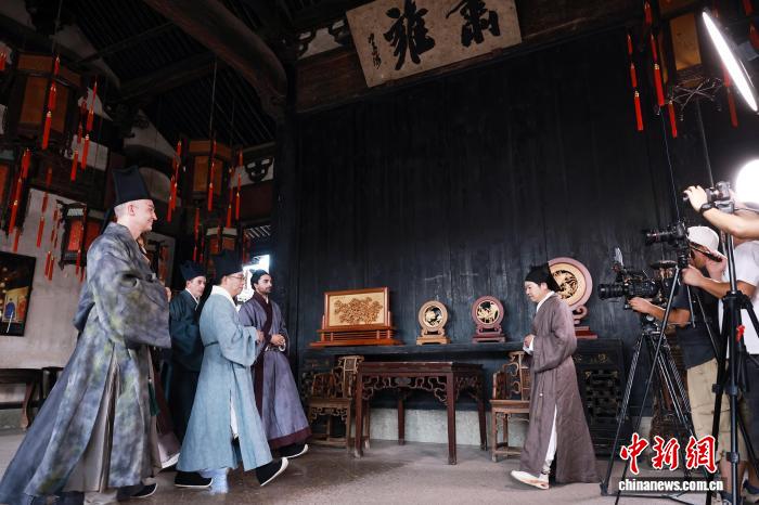 2025年8月24日,在浙江金华东阳卢宅景区,国际友人穿古装戏服,背台词、走机位……本次活动是2025“相聚浙里”国际人文交流活动的系列活动,邀请部分外国博主和友好使者参与以东阳木雕为主题的微短剧拍摄。 胡扬辉 摄