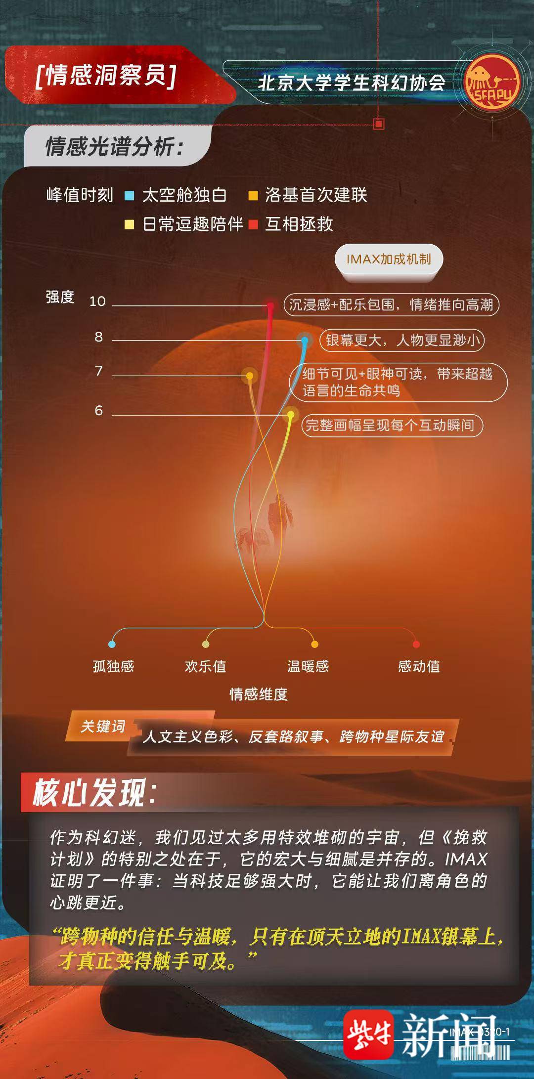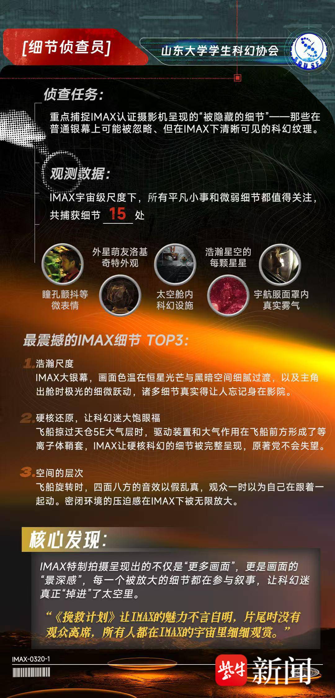 这份硬核又浪漫的研究报告,或许是《挽救计划》收获的最特别的“口碑”之一。当科幻迷用热爱做研究,他们给出的答案,本身就是最好的证明。正如报告中所说:“《挽救计划》为IMAX而生,IMAX才是它的完整形态。”而这份来自高校科幻圈的深度反馈,也让更多人看到了科幻电影与IMAX技术适配的更多可能。
