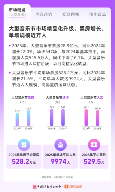 中国青年网北京4月23日电(记者孙丹丹)记者获悉中国演出行业协会与灯塔专业版昨日联合发布《格局升维,生态延展——2025现场音乐演出市场分析报告》(以下简称报告)。报告显示,2025年大型演唱会继续保持高增长态势,票房与观演人次双双创下新高。其中,大型演唱会票房达295.58亿,同比增长13.7%;观演人次近3800万,同比增长30.8%。