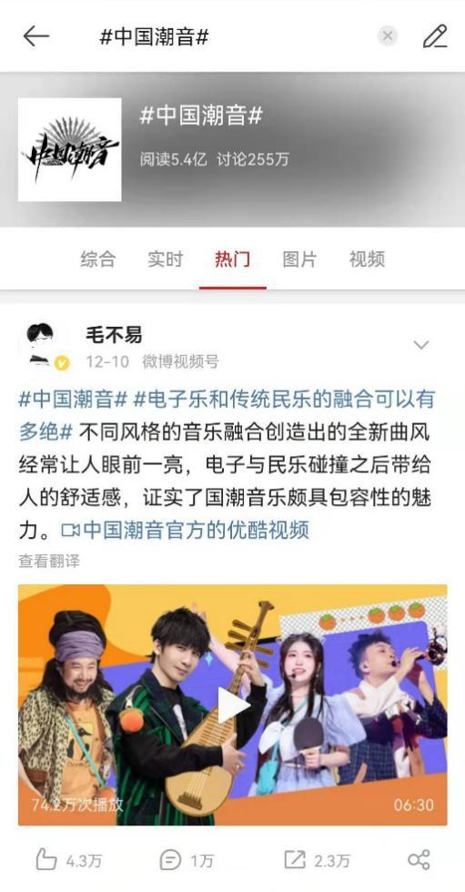 看过双唢呐版的《投名状》,才知道电子乐与民乐的融合有多绝!上周,酷狗《中国潮音》用一场国潮演唱会让听众感受到国风音乐的魅力,在网上多次掀起关于国潮音乐的大讨论,相关话题在微博获得5.3亿阅读量,249.6万的讨论量。