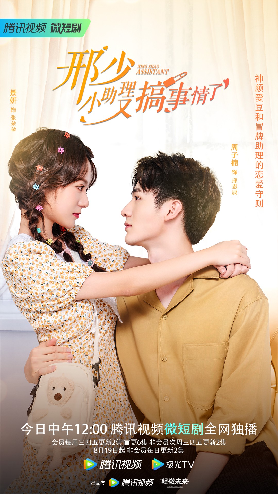 《邢少,小助理又搞事情了》剧情轻松浪漫,打造神颜爱豆与小助理的娱乐圈恋爱剧情,这是羡煞多少追星女孩的梦中情节,该剧将在7月27日12:00起登陆腾讯视频,会员每周三四五更新2集,首更6集,非会员次周三四五更新2集,8月19日起,非会员每日更新2集。一起来看小助理和娱乐圈大神谈恋爱!