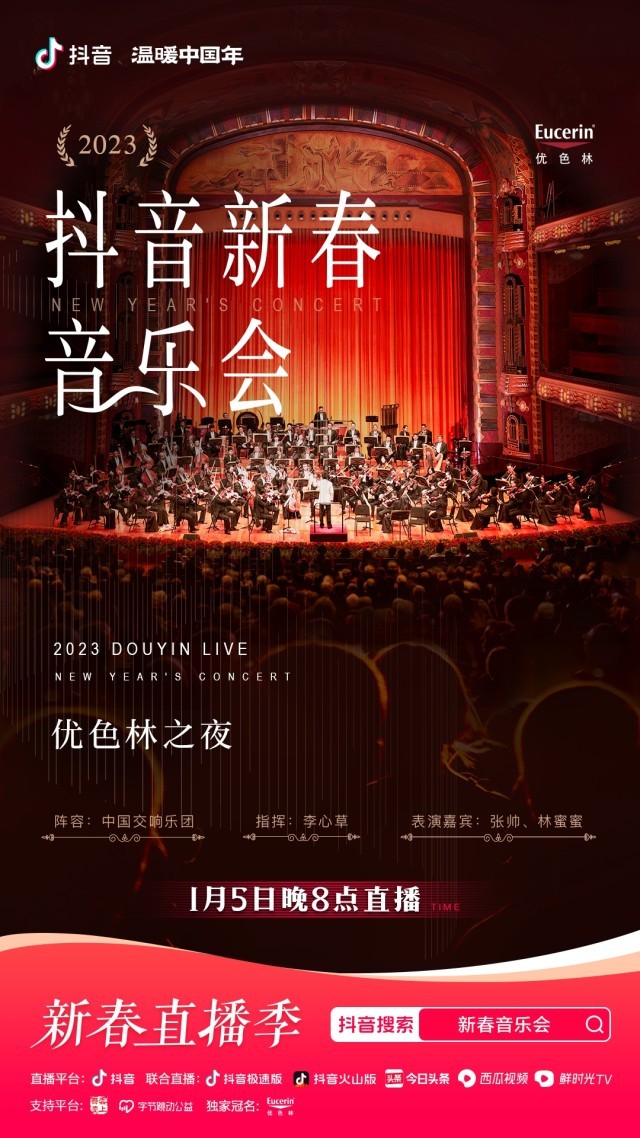 新春直播季的首场直播——“2023抖音新春音乐会-优色林之夜”将于1月5日晚8点准时开始,中国交响乐团将奏响华美的新春乐章,与大家共迎新春!1月5日晚8点,锁定抖音直播间,一起在音乐中,拉开春节的序幕。