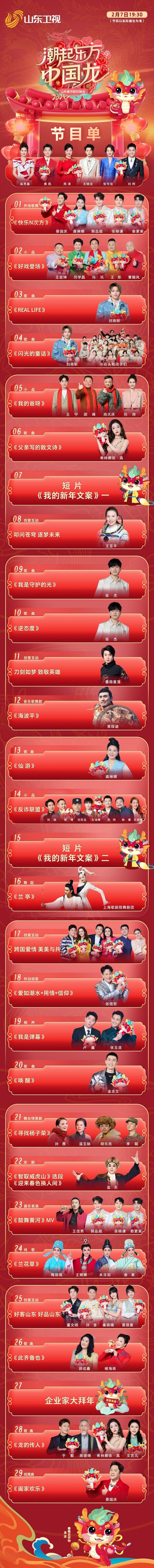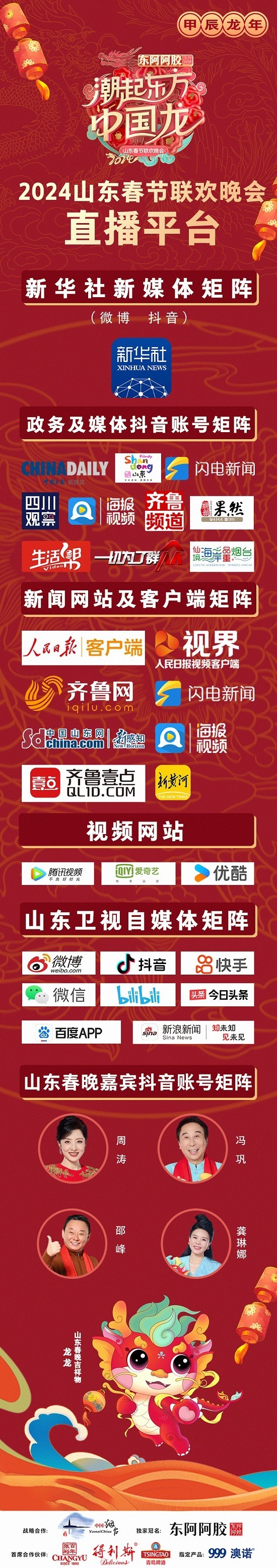 “潮起东方中国龙”,2024山东春节联欢晚会将于2月7日今晚19:30在全网播出。周涛携手山东广电主持人王晓龙、吴思嘉、黄凯、张可佳、刘柯共同主持,山东籍航天员王亚平,冯巩、张杰、刘雨昕、张信哲、龚琳娜、邵峰、希林娜依·高、于毅、金志文、郭品超、俞更寅、张晓谦等嘉宾将和大家见面。2024山东春晚将坚持温情表达、家国情怀,通过歌舞、戏曲、小品、相声、器乐表演、情景戏剧、互动故事等多种形式,力争为大家献上一场具有山东特色、全国意义、时代精神、国际表达的春节文化大餐。