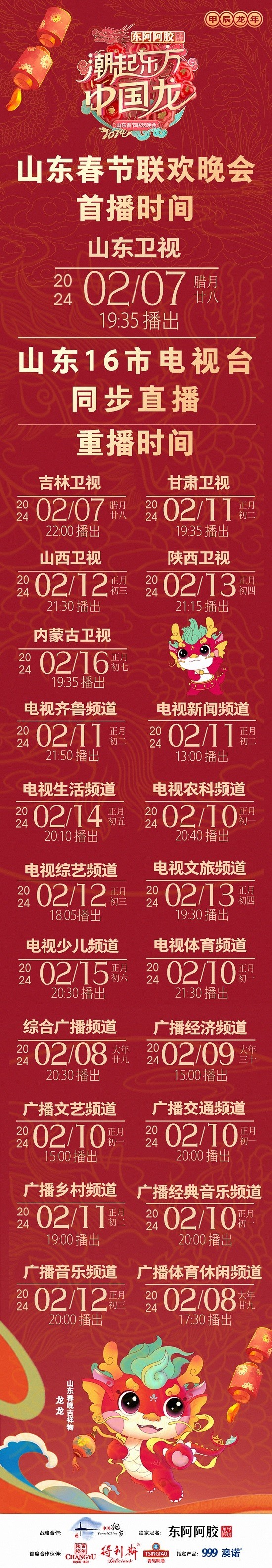2024山东春节联欢晚会,由滋补国宝 东阿阿胶独家冠名播出。千挑万挑 只有东阿阿胶。“潮起东方中国龙,胶润万家情意浓”,今晚19:30看山东春晚,大家一起共度新年!