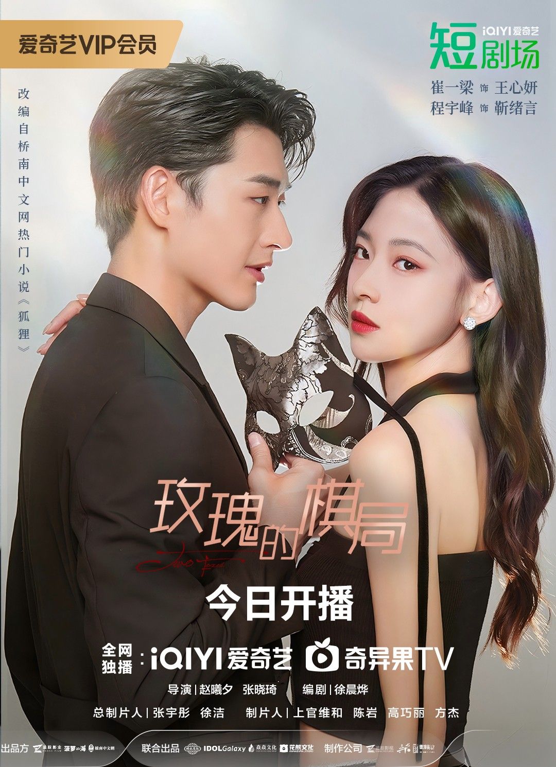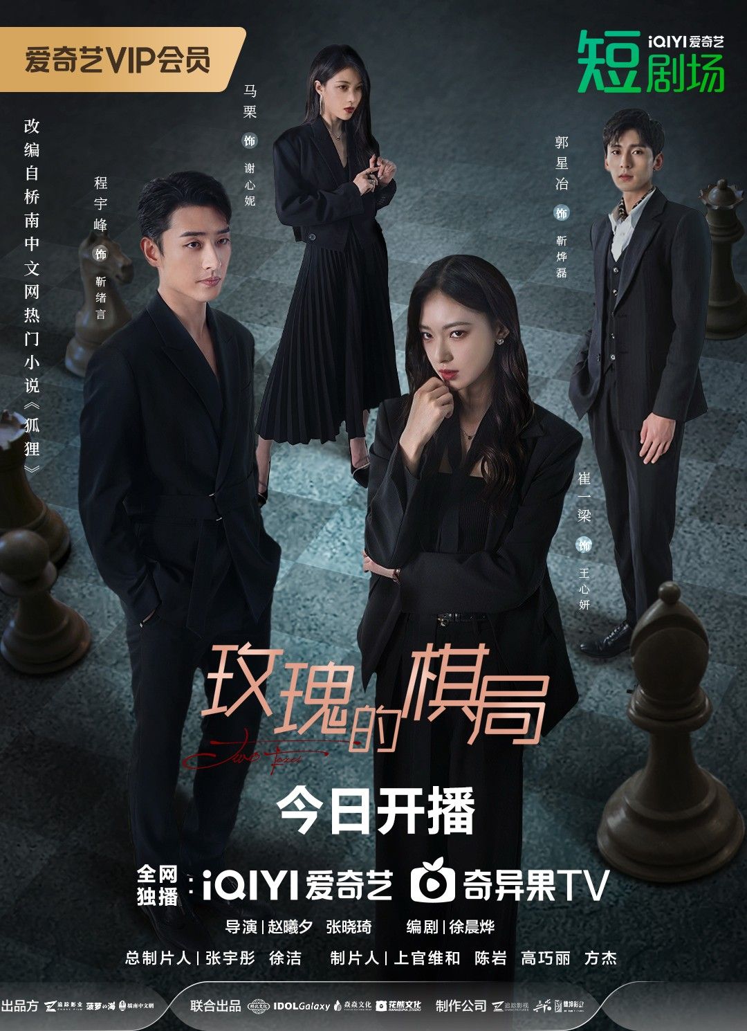 由北京追踪者也影业文化有限公司、上海菠萝的海文化艺术有限公司、北京桥南文化有限公司、北京鹅多多新戏科技有限公司、花熊文化传媒(北京)有限公司、宁波炎炎文化传媒有限公司联合出品的芳心纵爱都市复仇爽剧《玫瑰的棋局》,今日正式上线爱奇艺。该剧由青年导演赵曦夕执导,青年演员程宇峰、崔一梁、郭星冶、马栗主演。故事讲述了年轻貌美的投资总监王心妍(崔一梁 饰),因弟弟被他人谋害,开始精心谋划实行“复仇”。后又意外与靳氏集团公益事业部总经理靳绪言(程宇峰 饰)相遇,两人从彼此试探到双强联手,最终一起将真相查明。